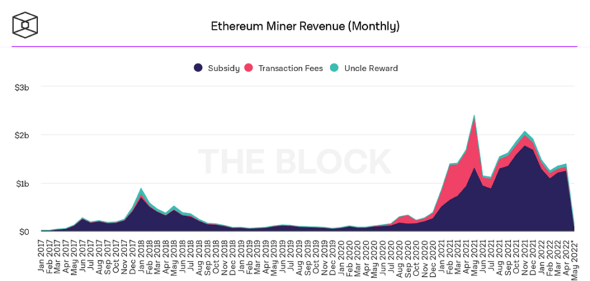 ในขณะที่ผู้ขุด Bitcoin มีรายได้ 1.16 พันล้านดอลลาร์ในเดือนเมษายน 2022นักขุด Ethereum สร้างรายได้ประมาณ 1.39 พันล้านดอลลาร์ แตกต่างจาก Bitcoin นอกจกานี้ รายได้จาก Ethereum เพิ่มขึ้น 3% จากเดือนมีนาคม