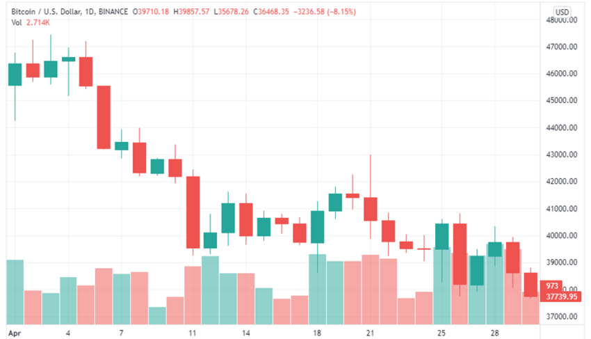 ในทางกลับกัน Bitcoin มีการซื้อขายในช่วงราคา 37,000 ดอลลาร์และ 44,000 ดอลลาร์ต่อเหรียญเป็นเวลาส่วนใหญ่ในเดือนเมษายน ทั้งนี้ ในเดือนมีนาคม Bitcoin มีราคาซื้อขายในช่วง 43,000 ดอลลาร์และ 48,000 ดอลลาร์