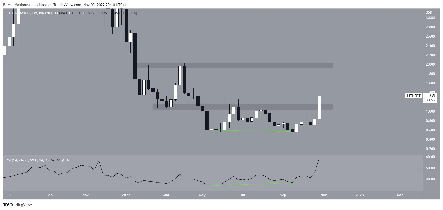 ในช่วงระหว่างเดือนพฤษภาคมถึงกันยายน 2022 ราคา LIT ทำให้เกิดแพตเทิร์นแบบ Double-bottom ซึ่งมักจะแสดงให้เห็นว่าราคาของสินทรัพย์จะพุ่งพรวด