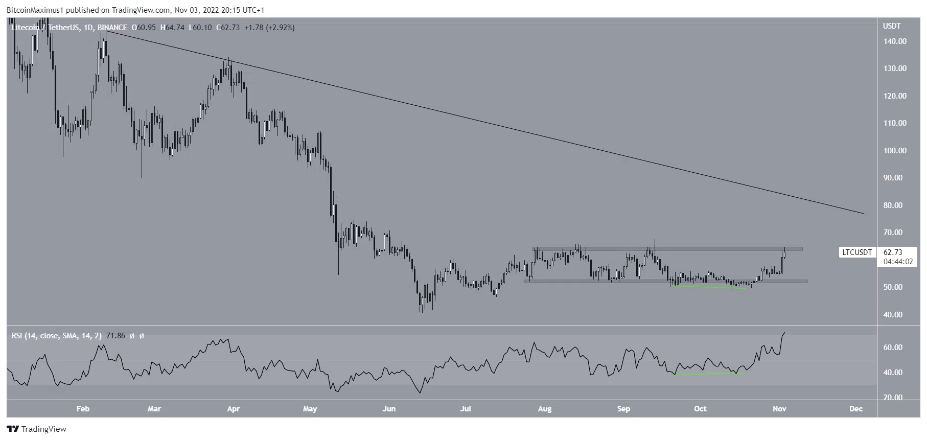 ราคา LTC เพิ่มขึ้นนับตั้งแต่วันที่ 13 ตุลาคม เมื่อมันลดต่ำกว่าระดับราคา 52 ดอลลาร์สหรัฐ หลังจากที่ราคาอยู่ในช่วงระดับราคาขั้นต่ำมาก่อน จากนั้น อัตราการเพิ่มขึ้นราคาเพิ่มขึ้นอย่างรวดเร็ว