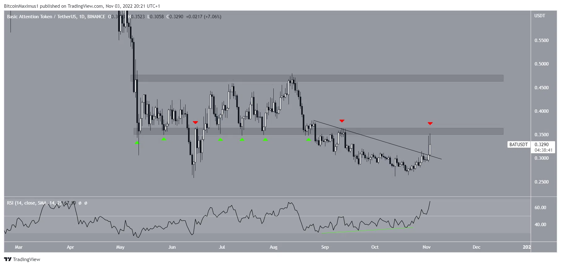 ราคา BAT พุ่งออกจากแนวต้านระยะสั้นจากมากไปน้อยในวันที่ 2 พ.ย. และแตะระดับสูงสุดที่ 0.352 ดอลลาร์สหรัฐในวันถัดไป การฝ่าวงล้อมได้รับการสนับสนุนโดย RSI ซึ่งขยับเหนือ 50 หลังจากสร้างความแตกต่างแบบรั้น (เส้นสีเขียว)