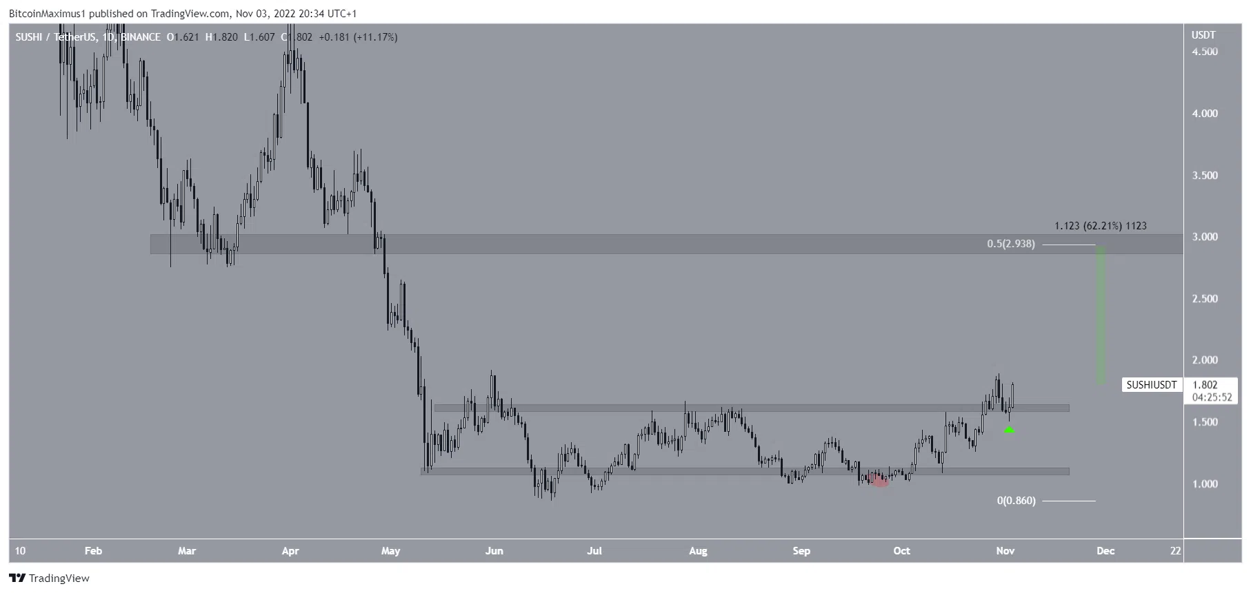 ราคาของ SUSHI เพิ่มขึ้นตั้งแต่เบี่ยงเบนต่ำกว่าพื้นที่ราคาสนับสนุนที่ 1.10 ดอลลาร์สหรัฐในวันที่ 25 กันยายน (วงกลมสีแดง) การเปลี่ยนแปลงของราคาขาขึ้นนำไปสู่ระดับสูงสุดที่ 1.89 ดอลลาร์ในวันที่ 30 ต.ค. ซึ่งทำให้เกิดการฝ่าวงล้อมจากแนวต้าน 1.62 ดอลลาร์