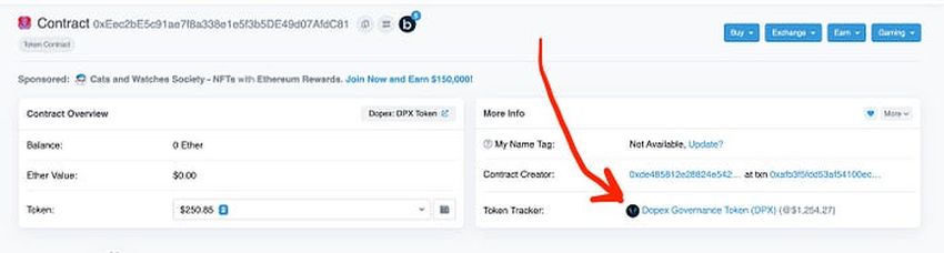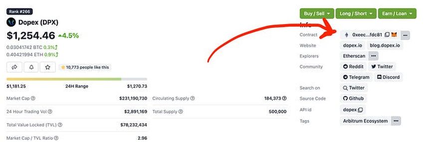 - เราเข้าไปดูที่ Contract address ของเหรียญนี้บน Coingecko แล้วดูที่ $DPX