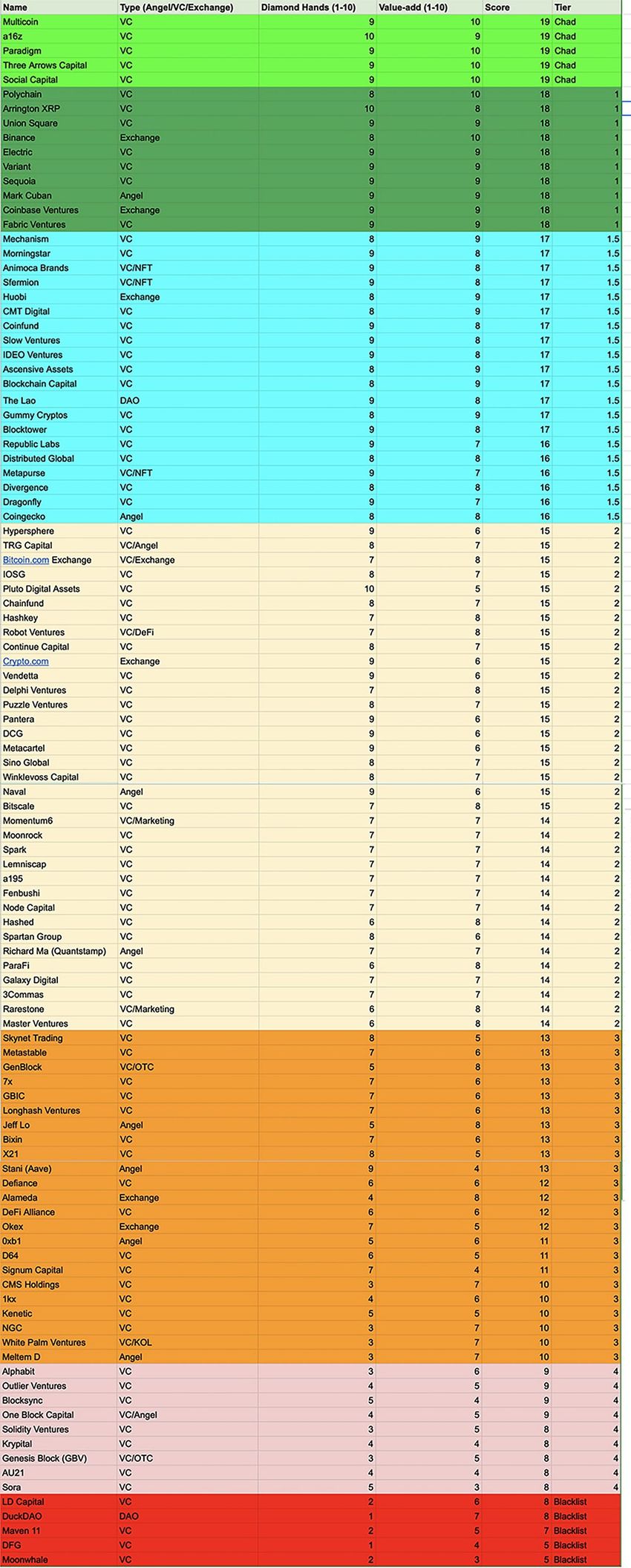 ลิส Investor ที่ดีและที่โกง บางครั้งเป็นคนลงทุนแรกๆก็ใช่ว่าจะประสบความสำเร็จเสมอไป ปัจจัยที่สำคัญมากๆอย่างหนึ่งคือ VC (Venture Capital) พวกเขาจะเป็นผู้ลงทุนในรอบแรกๆ พวกเขาจะเป็นคนแรกๆที่โปรเจ็คคริปโตจะไป Pitching (เสนอขาย) ด้วย เมื่อมี VC มาลงทุนในโปรเจ็คเหล่านี้แล้ว ส่วนใหญ่จะกลายมาเป็น Market Cap แรกสุดของโปรเจ็คนั้นๆ ซึ่ง VC นี้แหละจะบอกตัวเป๋งๆในการบอกเลยว่าโปรเจ็คนี้น่าลงทุนหรือไม่? หรือมันจะกลายเป็น Scam ในระยะสั้น? (คือเขาจะขายหมดหลังจากที่เหรียญลง DEX นั้นเอง)