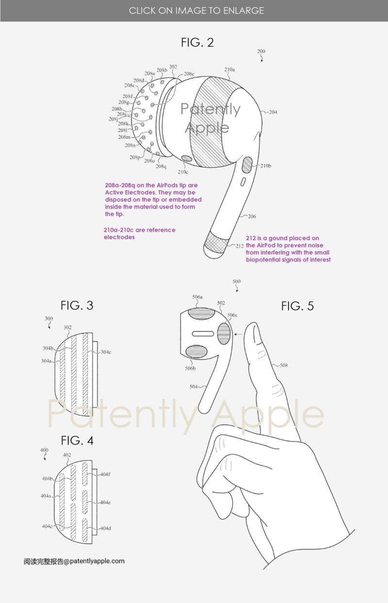ตัวอย่างสิทธิบัตรของ Apple 2 ด้านล่างแสดง AirPods รุ่นถัดไปมีความเป็นไปได้โดยมีชุดของ ‘Active Electrodes’ วางอยู่บนพื้นผิวของปลายที่เปลี่ยนได้ หรืออีกทางหนึ่ง Apple ตั้งข้อสังเกตว่าอิเล็กโทรดที่ใช้งานอยู่สามารถฝังอยู่ในวัสดุของส่วนปลายได้เช่นกัน