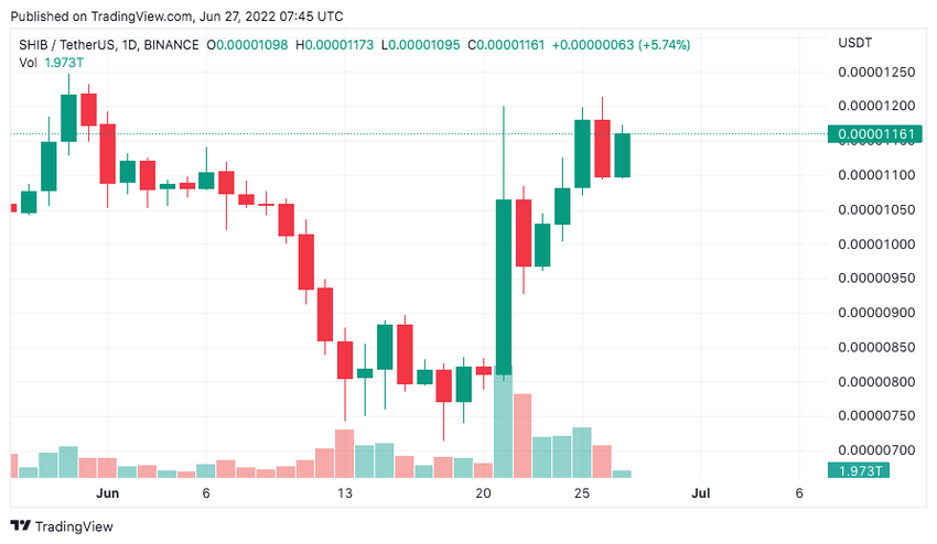 Sponsoredก่อนหน้านี้ นักลงทุนกังวลเกี่ยวกับ SHIB เนื่องจาก meme coin ลดลง 1.17% แม้ว่าวาฬ ETH จะซื้อเก็บมากขึ้น อย่างไรก็ตาม ดูเหมือนว่ามูลค่าได้เพิ่มขึ้นกว่า 40% โดย SHIB เพิ่มขึ้น 13.76% เมื่อสองวันก่อน โดยแตะระดับสูงสุดที่ 0.00001171 ดอลลาร์ ตามมูลค่าของ CoinMarketCap