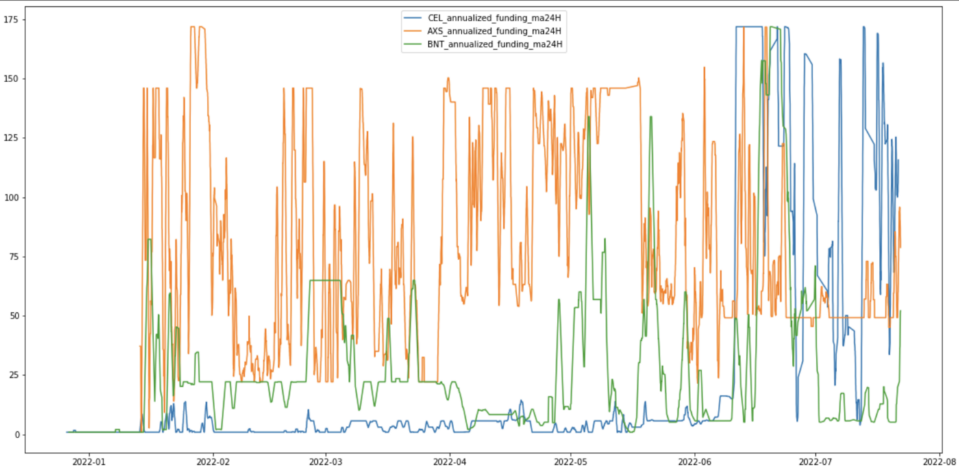 เพื่อให้แผนภูมิอ่านได้ ฉันลดอัตราให้สูงกว่า 200% นอกจากนี้ แทนที่จะแสดงผลตอบแทนจริง ฉันกำลังแสดง 24H MA ของ Funding rate มันจะทำให้แผนภูมิเรียบขึ้นเล็กน้อย (หมายเหตุ: มีบางวันที่ 0%-1% จะเห็นน้อยลงเนื่องจากค่าเฉลี่ย)