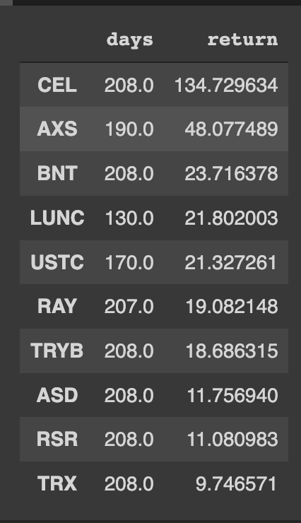 วิธีสร้าง Passive Income จาก FTX ตอน 2 ในบทความนี้เรามาลองทำเช่นเดียวกันสำหรับโทเค็นทั้งหมดและวางแผนอัตราการระดมทุนประจำปีเฉลี่ยของโทเค็น 10 อันดับแรกกัน แต่น่าเศร้าที่ฉันได้แผนภูมิที่น่ากลัวดังต่อไปนี้ แต่ละเหรียญตอบแทนสูงให้ผลตอบแทนสูงมากเพียงหนึ่งชั่วโมง
