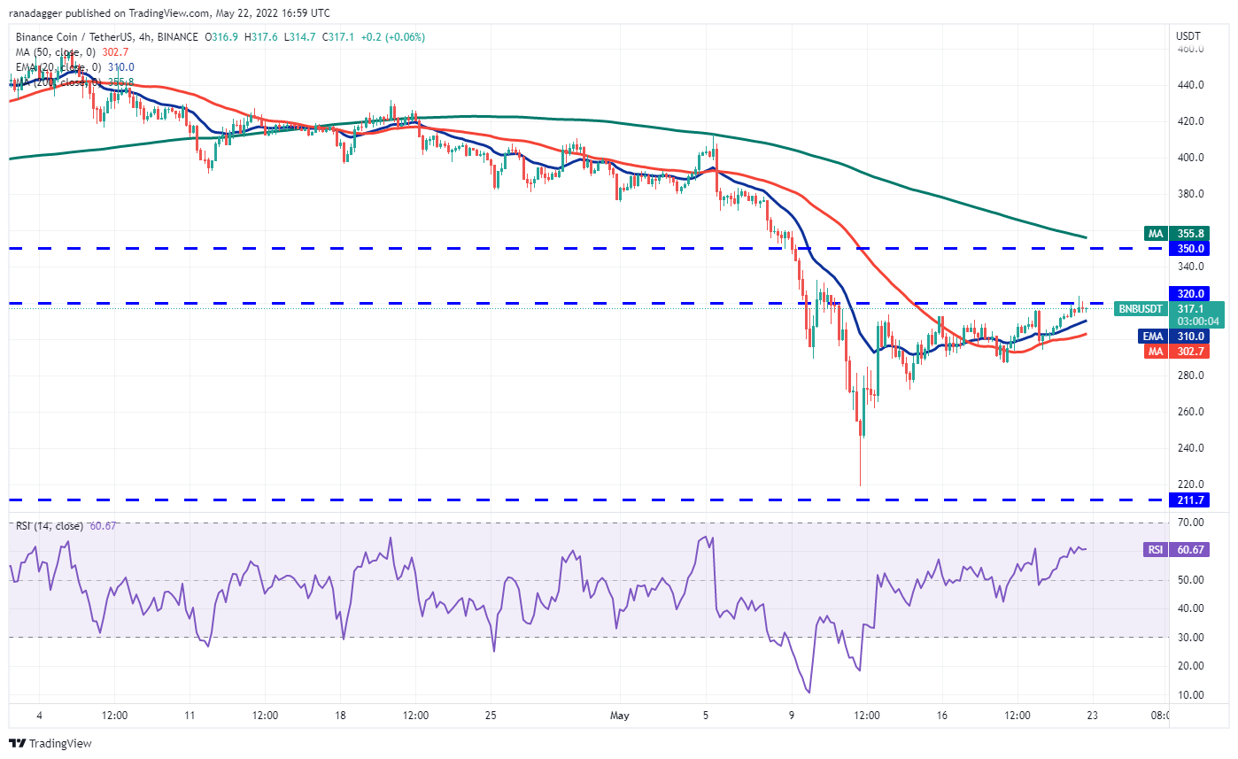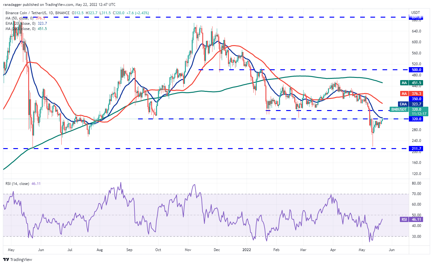 Binance Coin (BNB) ฟื้นตัวอย่างรวดเร็วจากแนวรับที่สำคัญที่ 211 ดอลลาร์ และแตะแนวต้านเหนือเส้น EMA 20 วันที่ $323 นี่เป็นระดับที่สำคัญสำหรับหมีที่จะตั้งรับ เนื่องจากการทะลุและปิดเหนือระดับนั้นอาจบ่งชี้ว่าจุดต่ำสุดอยู่ในตำแหน่ง