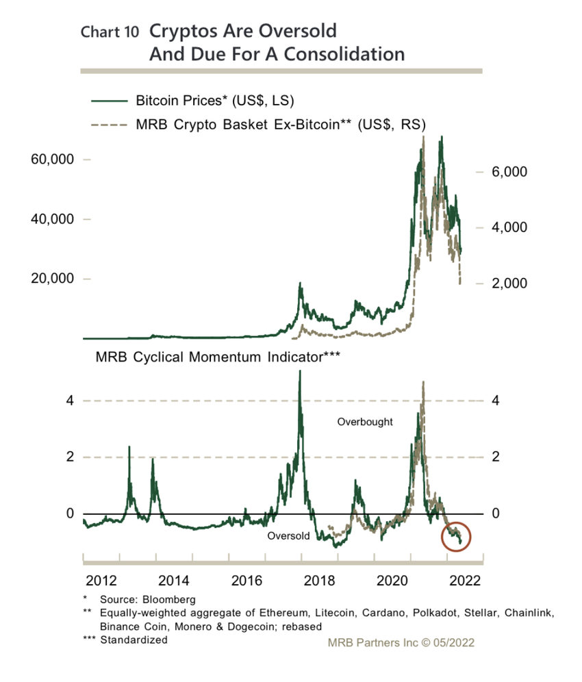 แผนภูมิด้านล่างแสดง ตัวบ่งชี้โมเมนตัมตามวัฏจักรของ MRB Partners ซึ่งแสดงสถานะในช่วงที่มีการขายมากเกินไป ซึ่งเป็นการขาย crypto มากที่สุดตั้งแต่ปี 2018 นั่นอาจชี้ไปที่การตีกลับเป็นขาลงในระยะสั้นของคริปโต