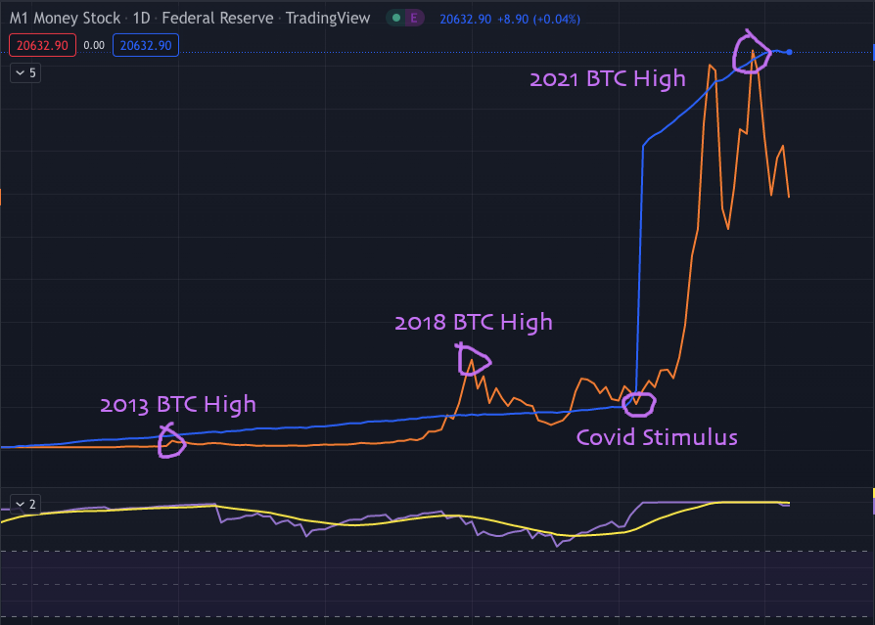 สภาพตลาดเมื่อ Fed พิมพ์เงินมหาศาล แผนภูมิแรกคือปริมาณเงิน M1 (เส้นสีน้ำเงิน) และราคา BTC (เส้นสีส้ม) ย้อนกลับไปก่อนปี 2008 พังทลายจนถึงก่อนการกระตุ้นของ Covid ในปี 2020