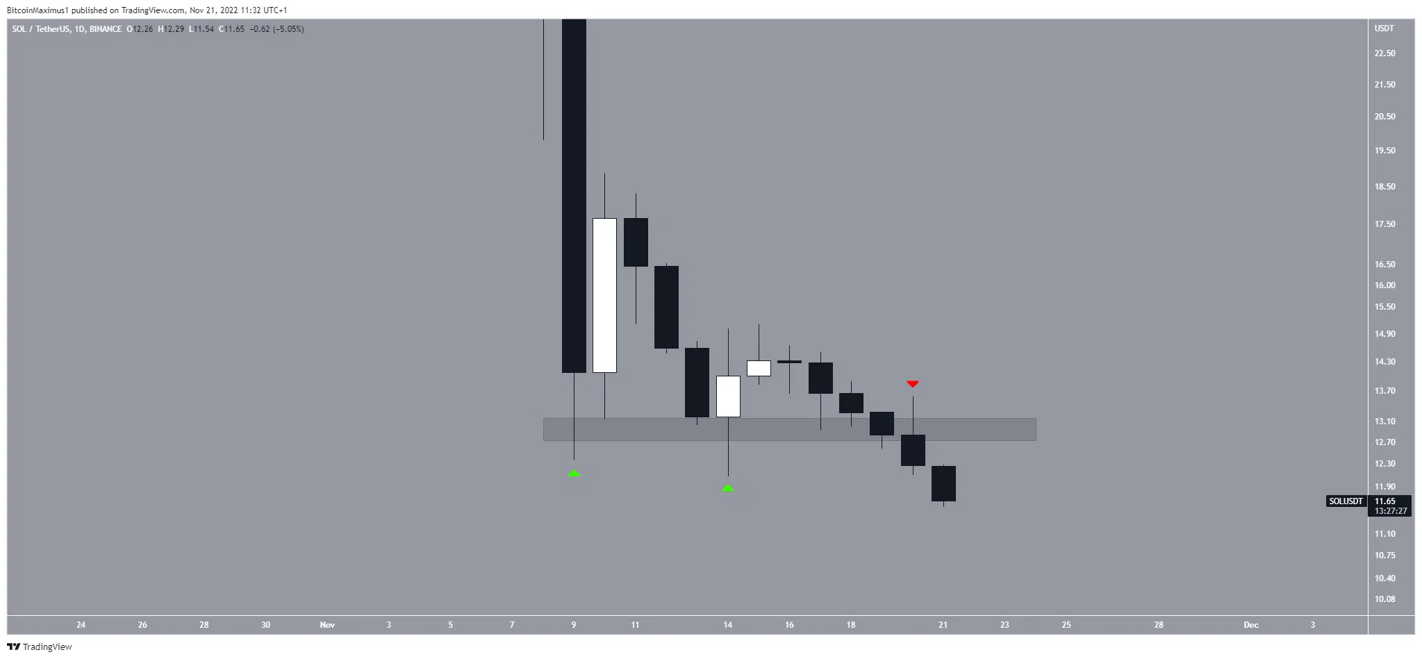 กราฟรายวันระยะสั้นนั้นสนับสนุนสมมติฐานนี้ ในขณะที่ราคา Solana เด้งกลับที่บริเวณ 13 ดอลลาร์ มันได้ทำให้เกิดไส้เทียนยาวด้านล่าง (Lower Wick) 2 อัน (ไอคอนสีเขียว) แต่หลังจากนั้น ราคาของมันก็ร่วงลง ขณะนี้ บริเวณแนวรับเดิมที่ 13 ดอลลาร์ มีแนวโน้มที่จะทำหน้าที่เป็นแนวต้านแทน (ไอคอนสีแดง)