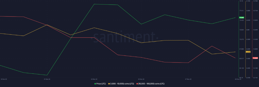 แม้ว่าราคาจะเพิ่มขึ้นในอัตรา 2.92% ในแต่ละวัน แต่การซื้อขายที่ราคา $78.15 ณ เวลาปัจจุบัน แต่ความเชื่อมั่นในตัว LTC ลดลงเรื่อย ๆ ความเชื่อมั่นเชิงลบมักจะหมายความว่าเหรียญไม่มีความต้องการมากนักหรือไม่ค่อยเป็นกระแส