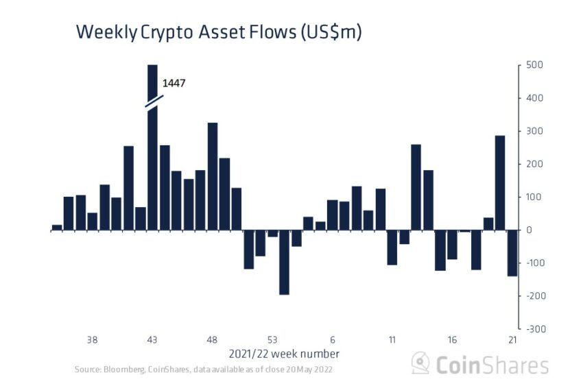การสิ้นสุดการบันทึกการลงทุนในผลิตภัณฑ์สินทรัพย์ดิจิทัลสำหรับการลงทุนรายสัปดาห์สิ้นสุเมื่อวันที่ 20 พฤษภาคม 2022 โดยมียอดการถอนการลงทุน (Outflow) ถึง 141 ล้านดอลลาร์สหรัฐท่ามกลางภาวะที่ตลาดอ่อนแอ