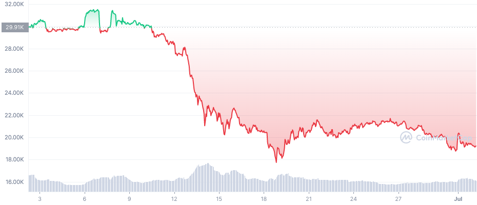 เดือนมิถุนายน Bitcoin สูญเสียมูลค่าไปแล้วกว่า 40% หลังร่วงหลุดไปที่ 19,000