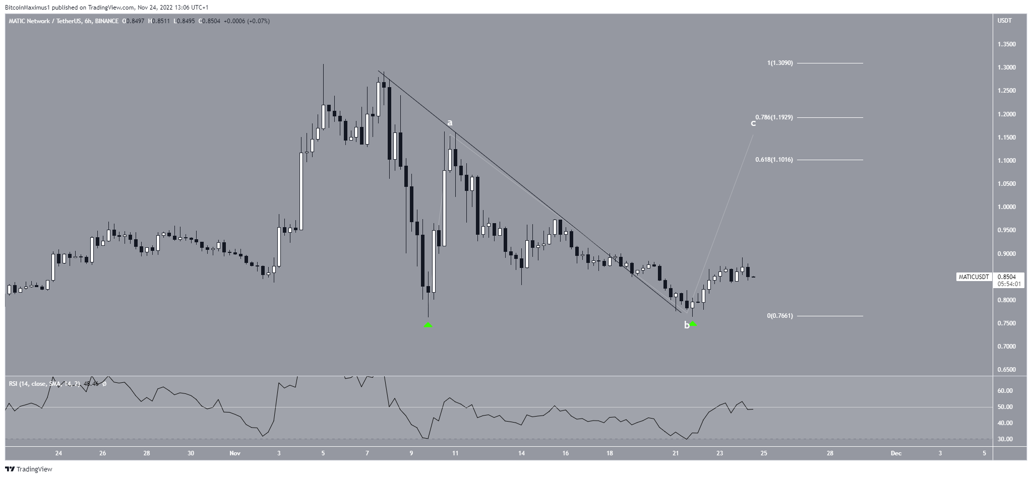 การวิเคราะห์ทางเทคนิค 6 ชั่วโมงแสดงให้เห็นว่าราคา Polygon สร้างรูปแบบ Double Bottom (รูปแบบที่เป็นสัญญาณว่ากราฟกำลังจะกลับตัวเป็นขาขึ้น) (ไอคอนสีเขียว) จุดต่ำสุดที่ 2 เกิดขึ้นหลังจากที่ Polygon ได้ Breakout ออกจากแนวต้านระยะสั้น อย่างไรก็ตาม รูปแบบดังกล่าวไม่ได้ถูกรวมเข้ากับสัญญาณ Bullish Divergence (สัญญาณของราคาสินทรัพย์ที่ปรับตัวลดลงและทำจุดต่ำสุดใหม่ ในขณะที่ตัวชี้วัดทางเทคนิคนั้นปรับตัวสูงขึ้นขัดแย้งกับราคา) ใน RSI ซึ่งเป็นการลดความถูกต้องของมันลง