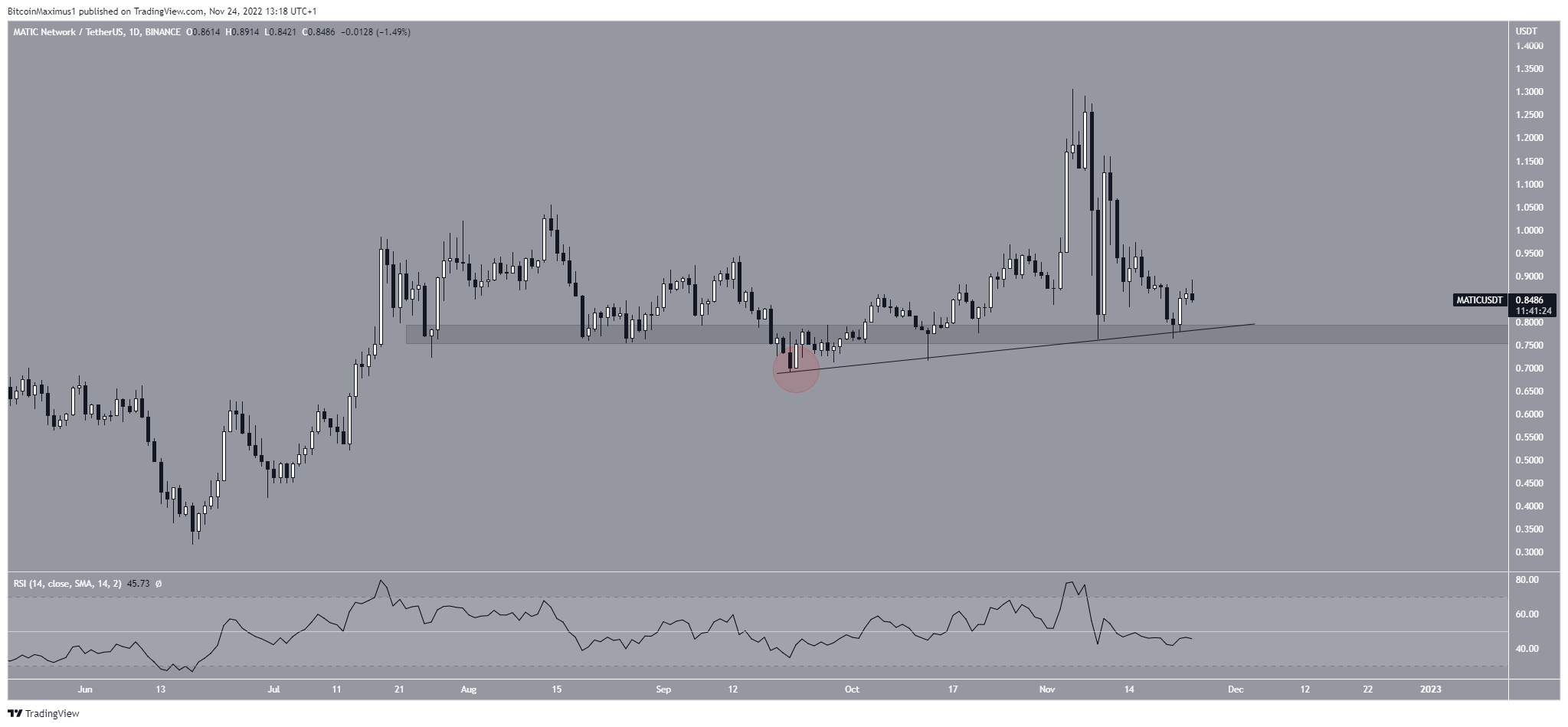 ดังนั้น ไม่ว่าราคาขอ Polygon จะ Breakdown (การที่กราฟมีราคาทะลุแนวรับที่ตั้งเอาไว้) ลงมาจากพื้นที่ 0.80 ดอลลาร์หรือไม่ มันก็อาจจะส่งผลอย่างมากต่อราคาในอนาคต การ Breakdown ลงมายังจะทำให้ RSI ลดลงต่ำกว่า 50 ซึ่งทำให้การคาดการณ์ราคากลายเป็นขาลง