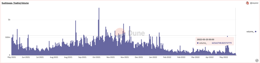 ยอดผู้ใช้งานต่อเดือน (MAU) ของ Sushiswap ลดลงเล็กน้อยจาก 70,000 ในเดือนเมษายนเป็น 60,000 ในเดือนพฤษภาคม MAU ทำสถิติสูงสุดเป็นประวัติการณ์ที่ 170,000 ในเดือนพฤศจิกายน 2021 ตามข้อมูลของ Dune Analytics ปริมาณการซื้อขายบน DEX ก็ลดลงเหลือเพียง 6 ล้านดอลลาร์เมื่อวานนี้ จากระดับสูงสุดตลอดกาลที่ 1.34 พันล้านดอลลาร์