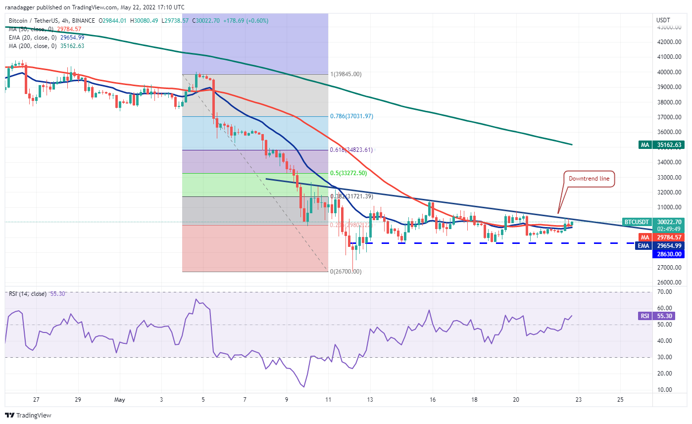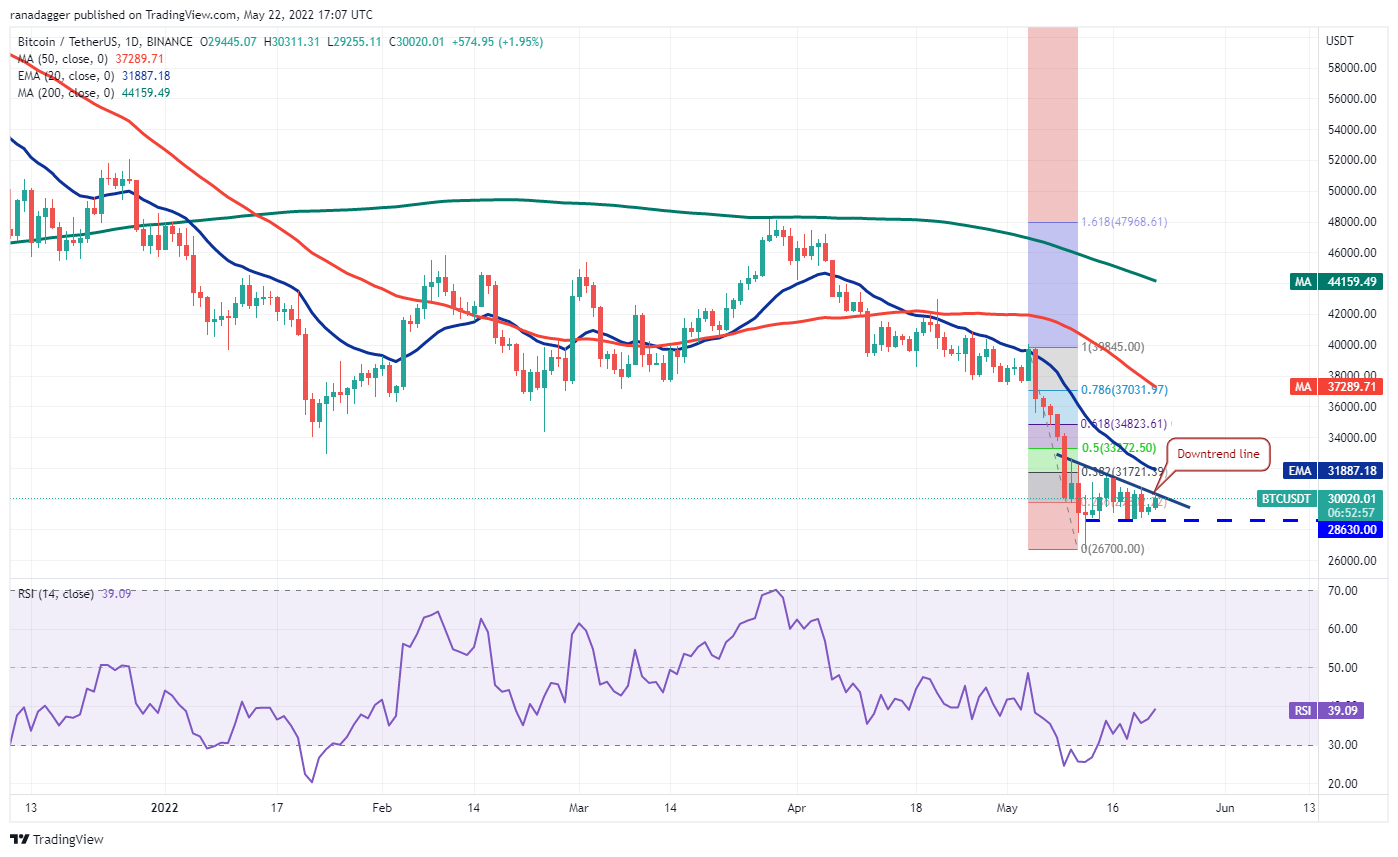 Bitcoin ดีดตัวขึ้นจากแนวรับที่สำคัญที่ 28,630 ดอลลาร์ในวันที่ 20 พฤษภาคม ซึ่งบ่งชี้ว่าการซื้อที่แข็งแกร่งใกล้ระดับนี้ ตลาดกระทิงกำลังพยายามผลักดันราคาให้อยู่เหนือเส้นแนวโน้มขาลง ซึ่งอาจเป็นสัญญาณบ่งชี้แรกว่าแรงกดดันในการขายอาจลดลง