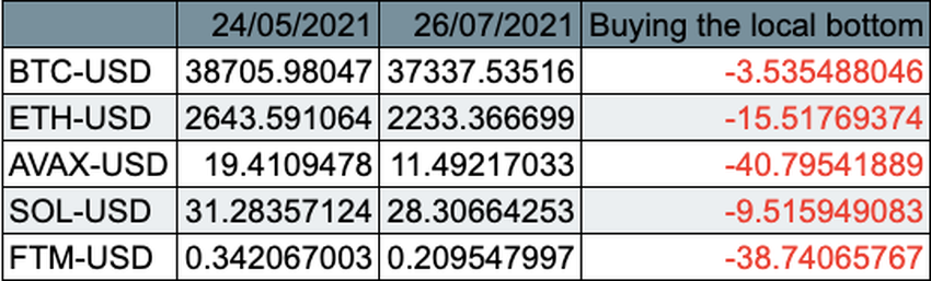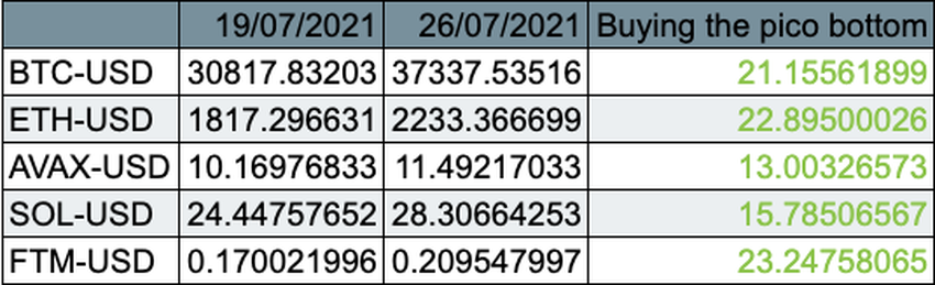แน่นอนว่าวันที่ 19 กรกฎาคมเป็นช่วงเวลาที่ดีที่สุดในการซื้อโทเค็น แต่เนื่องจากมันไม่สมเหตุสมผลเลยที่จะจับเวลาจุดต่ำสุดที่แน่นอน เราสามารถสรุปได้ว่าคนส่วนใหญ่ที่ซื้อ Dip ทำราคาประมาณวันที่ 24 พฤษภาคม นี่เป็นเทียนสีเขียวแท่งแรกที่เราเห็นหลังจากสัปดาห์ที่มีแนวโน้มลดลง