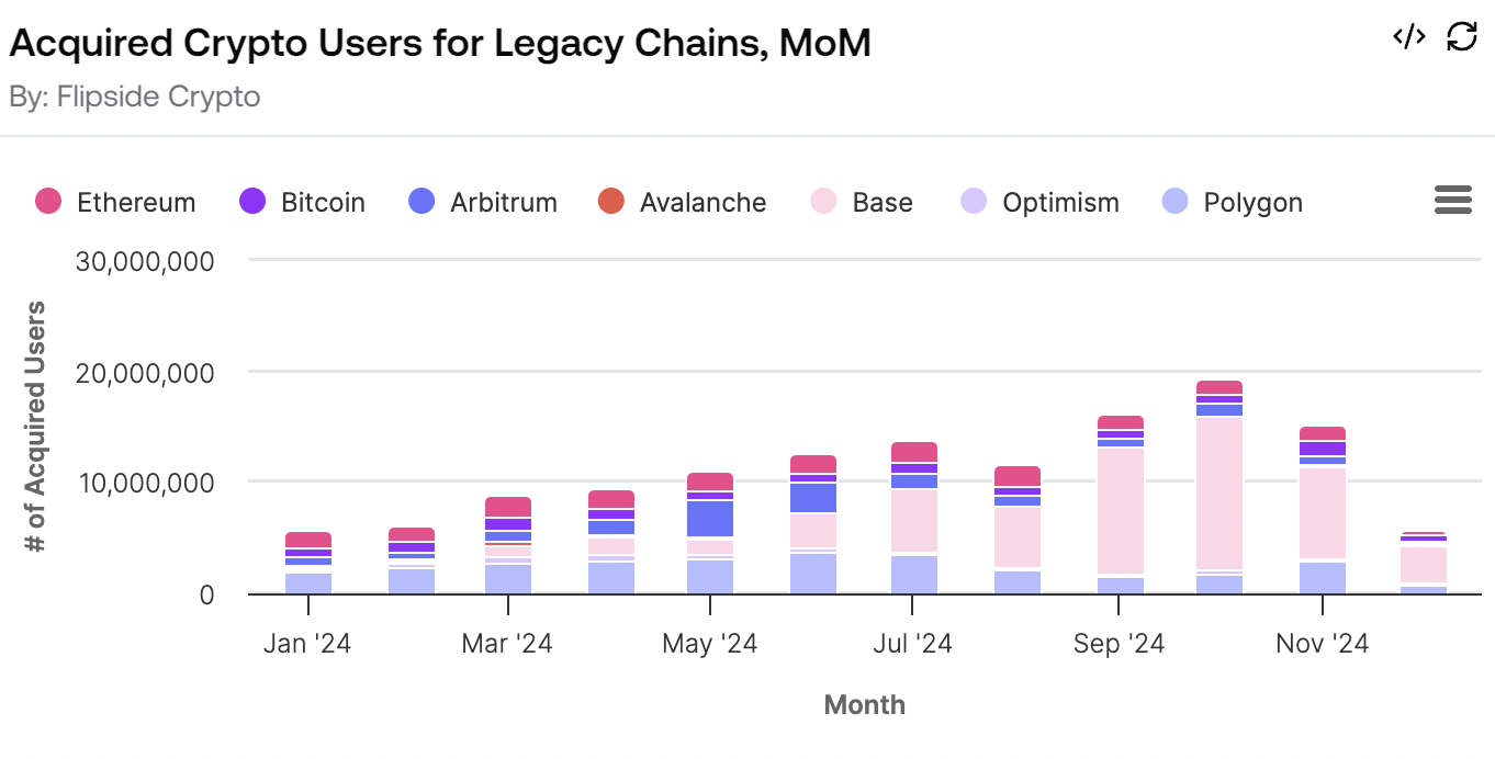Base, แพลตฟอร์มบล็อกเชน ที่พัฒนา โดย Coinbase, นำตลาดในปี 2024 ด้วยผู้ใช้ใหม่ 13.7 ล้านคนในเดือนตุลาคมเพียงเดือนเดียว การเพิ่มขึ้นนี้ทำให้ Base เป็นเชนที่เติบโตเร็วที่สุด แซงหน้า Ethereum ที่มีค่าเฉลี่ยคงที่ของผู้ใช้ใหม่ 1.56 ล้านคนต่อเดือน ในการเปรียบเทียบ การเติบโตของ Bitcoin ล่าช้าแม้ว่าราคาจะถึง 100,000 USD ซึ่งบ่งบอกถึงความสนใจในการเก็งกำไรมากกว่าการเพิ่มผู้ใช้ใหม่