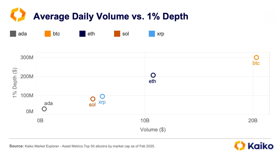 แม้ว่าปริมาณการชำระบัญชีของ ADA จะต่ำกว่า XRP หรือ SOL แต่ก็มีความผันผวนมากที่สุดในสามตัว ตามรายงานล่าสุดของ Kaiko ADA มีความลึกของตลาดต่ำที่สุดในบรรดา altcoins ห้าตัวที่รวมอยู่ใน สำรองคริปโตของสหรัฐฯ