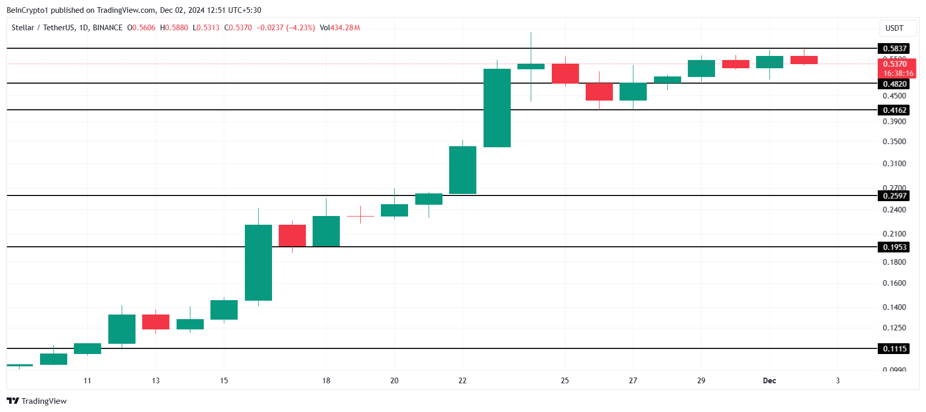 ปัจจุบัน XLM ยังคงอยู่เหนือระดับสนับสนุนหลักที่ 0.41 USD ซึ่งดูเหมือนว่าจะมีตำแหน่งที่ดีในการดำเนินแนวโน้มขาขึ้นต่อไป ระดับนี้ทำหน้าที่เป็นพื้นแข็งแรง ป้องกันการลดลงของราคาที่สำคัญ อย่างไรก็ตาม การลดลงต่ำกว่า 0.41 USD จะทำให้มุมมองขาขึ้นเป็นโมฆะ อาจส่ง altcoin ลงไปที่ 0.25 USD