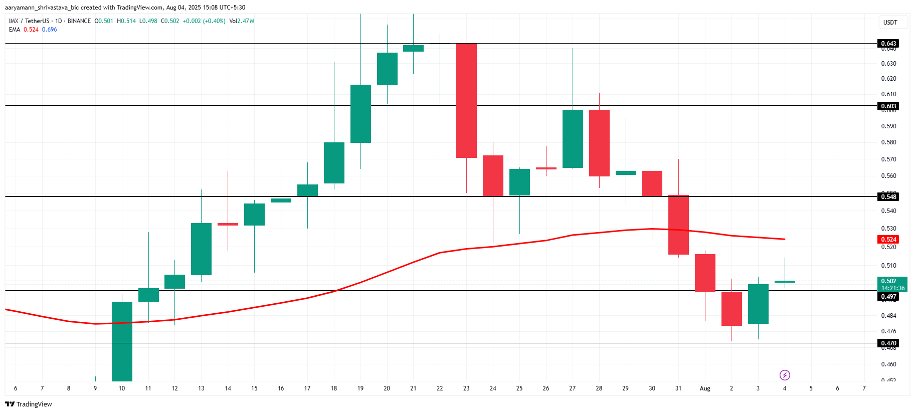 อย่างไรก็ตาม หากความเชื่อมั่นของนักลงทุนยังคงไม่แน่นอนและความต้องการไม่เกิดขึ้น IMX อาจเผชิญกับแรงกดดันในการขายต่อเนื่อง ในสถานการณ์เช่นนี้ ราคาของ IMX อาจลดลงต่ำกว่า USD0.497 และลดลงไปที่ USD0.470 หรือต่ำกว่า ซึ่งจะทำให้มุมมองที่เป็นขาขึ้นไม่ถูกต้อง ส่งสัญญาณถึงความเสี่ยงขาลงเพิ่มเติม สำหรับ altcoin