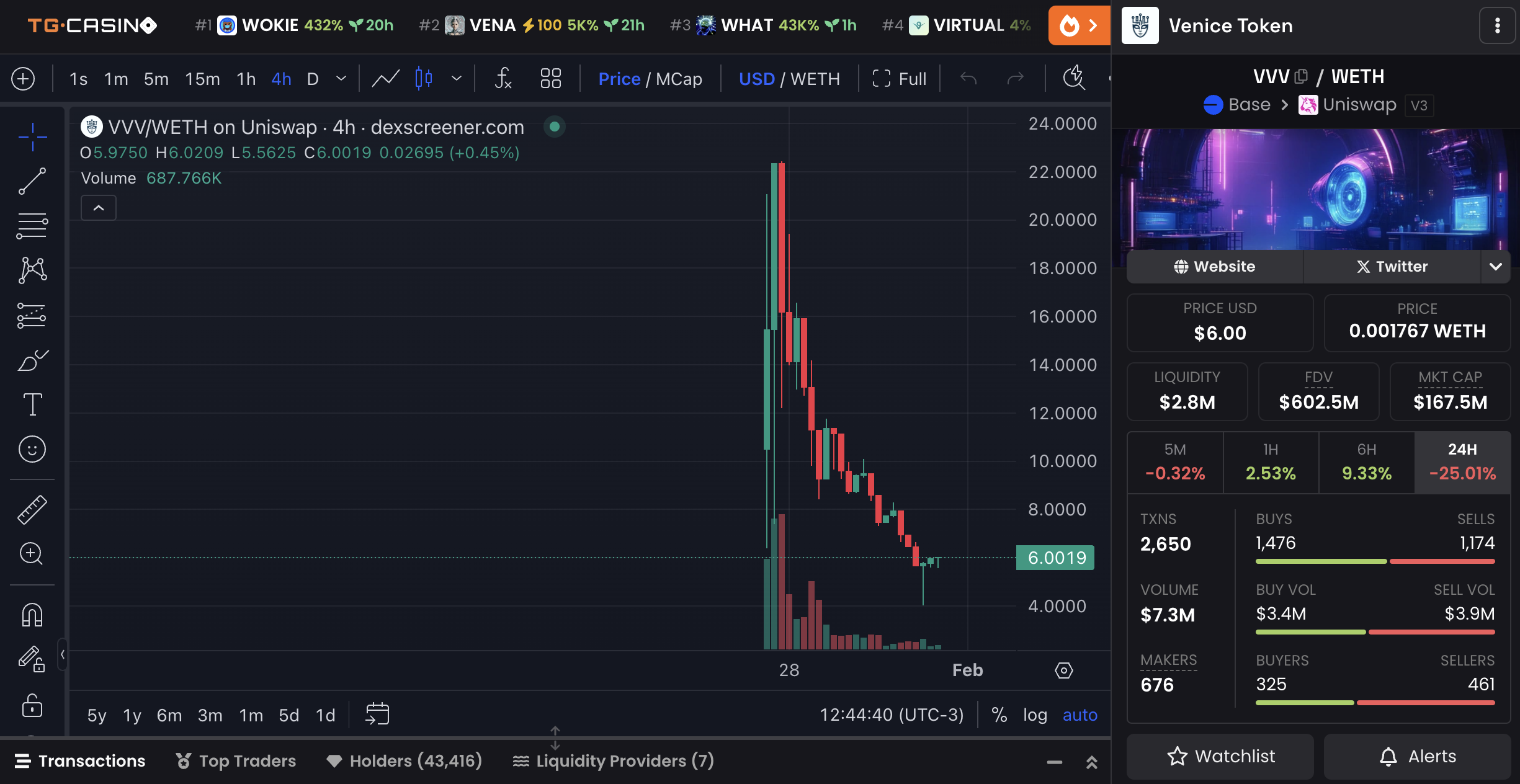 VVV ถูกแจกจ่ายให้กับผู้ใช้แรกเริ่มและตอนนี้มีให้บริการบน Base chain และเป็นหนึ่งในคริปโตใหม่ที่ใหญ่ที่สุดของ Base ที่เปิดตัวเมื่อเร็วๆ นี้ แม้ว่าราคาจะพุ่งขึ้นในตอนแรก แต่ก็ลดลงอย่างมาก อย่างไรก็ตาม โทเค็นนี้มีผู้ถือครองกว่า 43,000 รายและมูลค่าตลาดประมาณ 167 ล้าน USD