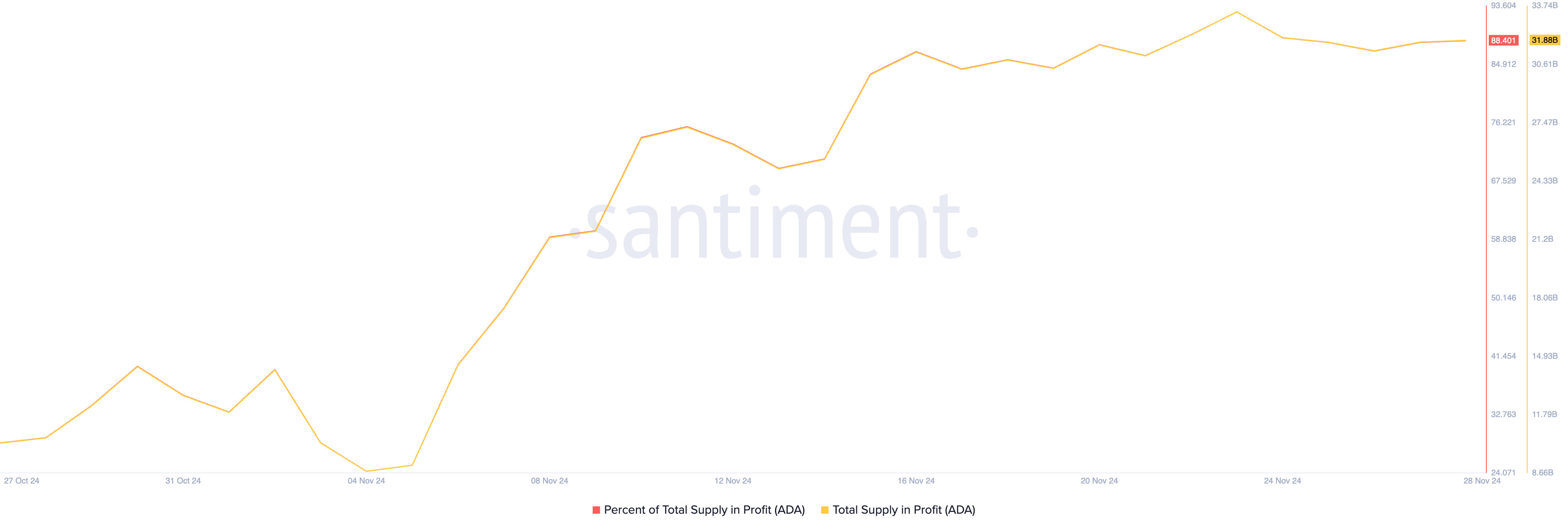 การพุ่งขึ้นสองหลักของ Cardano ในสัปดาห์ที่ผ่านมาได้ผลักดันส่วนสำคัญของอุปทานหมุนเวียนของ coin เข้าสู่พื้นที่กำไร ในราคาตลาดปัจจุบัน นักลงทุนถือ ADA coins จำนวน 32 พันล้านเหรียญ มูลค่า 31 พันล้าน USD ในกำไร คิดเป็น 88.40% ของอุปทานหมุนเวียนของ ADA