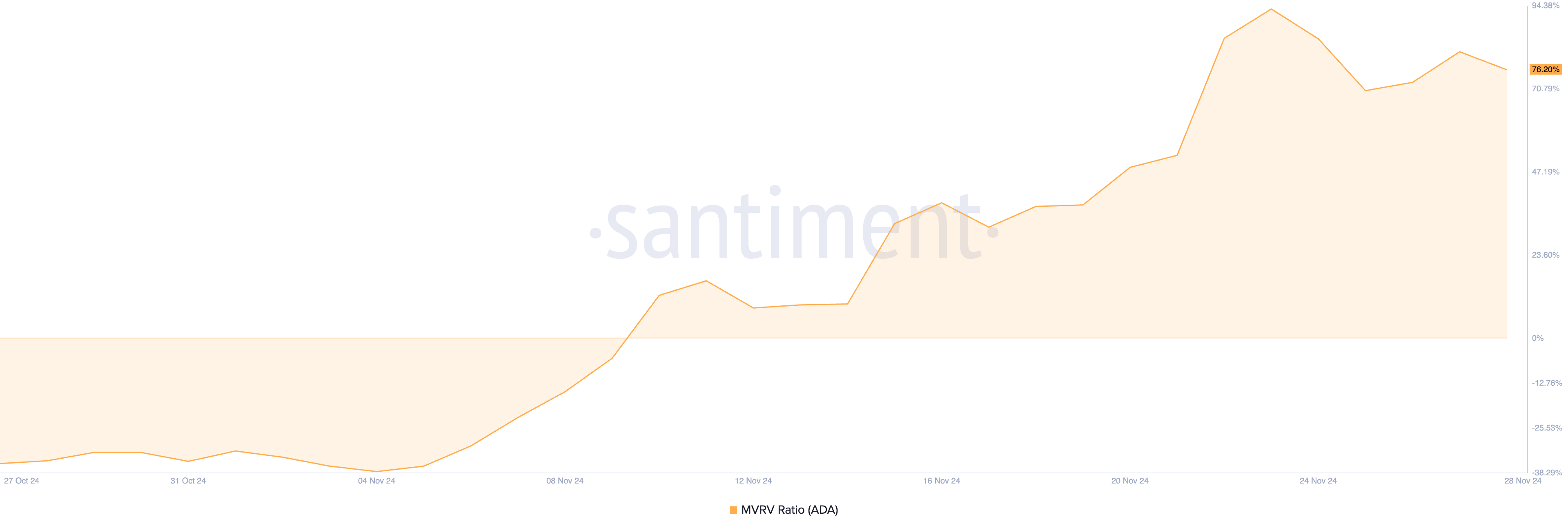 การประเมิน อัตราส่วนมูลค่าตลาดต่อมูลค่าที่รับรู้ (MVRV) ของ ADA ยืนยันความเสี่ยงนี้ ตามข้อมูลของ Santiment อัตราส่วน MVRV ปัจจุบันของ ADA อยู่ที่ 76.20%