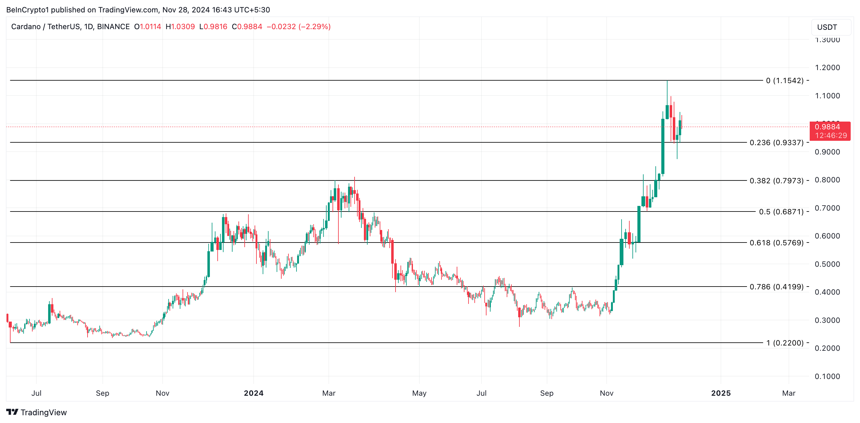 ในขณะที่เขียน ADA ซื้อขายที่ 0.98 USD อยู่เหนือแนวรับที่ 0.93 USD หากกิจกรรมการทำกำไรเริ่มขึ้น ราคาของ coin จะพยายามทดสอบระดับแนวรับนี้ หากไม่สามารถรักษาได้ แนวโน้มขาลงจะได้รับการยืนยัน และ ADA จะลดลงไปที่ 0.79 USD
