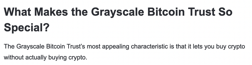 - Grayscale สร้างกระดาษแผ่นหนึ่งที่มีตัวอักษร “GBTC” ซึ่งคุณสามารถซื้อได้ในตลาดหุ้นเพื่อแสร้งทำเป็นว่าคุณเจ๋งพอที่จะเป็นเจ้าของ Bitcoins ในกล่อง การซื้อ Bitcoins เคยเป็นเรื่องยากและผู้คนก็เกียจคร้าน แต่พวกเขาได้ยินเกี่ยวกับเงินทางอินเทอร์เน็ตมหัศจรรย์นี้และพวกเขาต้องการ GBTC อำนวยความสะดวกนี้ เว็บไซต์ “คำแนะนำการลงทุน” นี้สรุปได้ดีทีเดียว