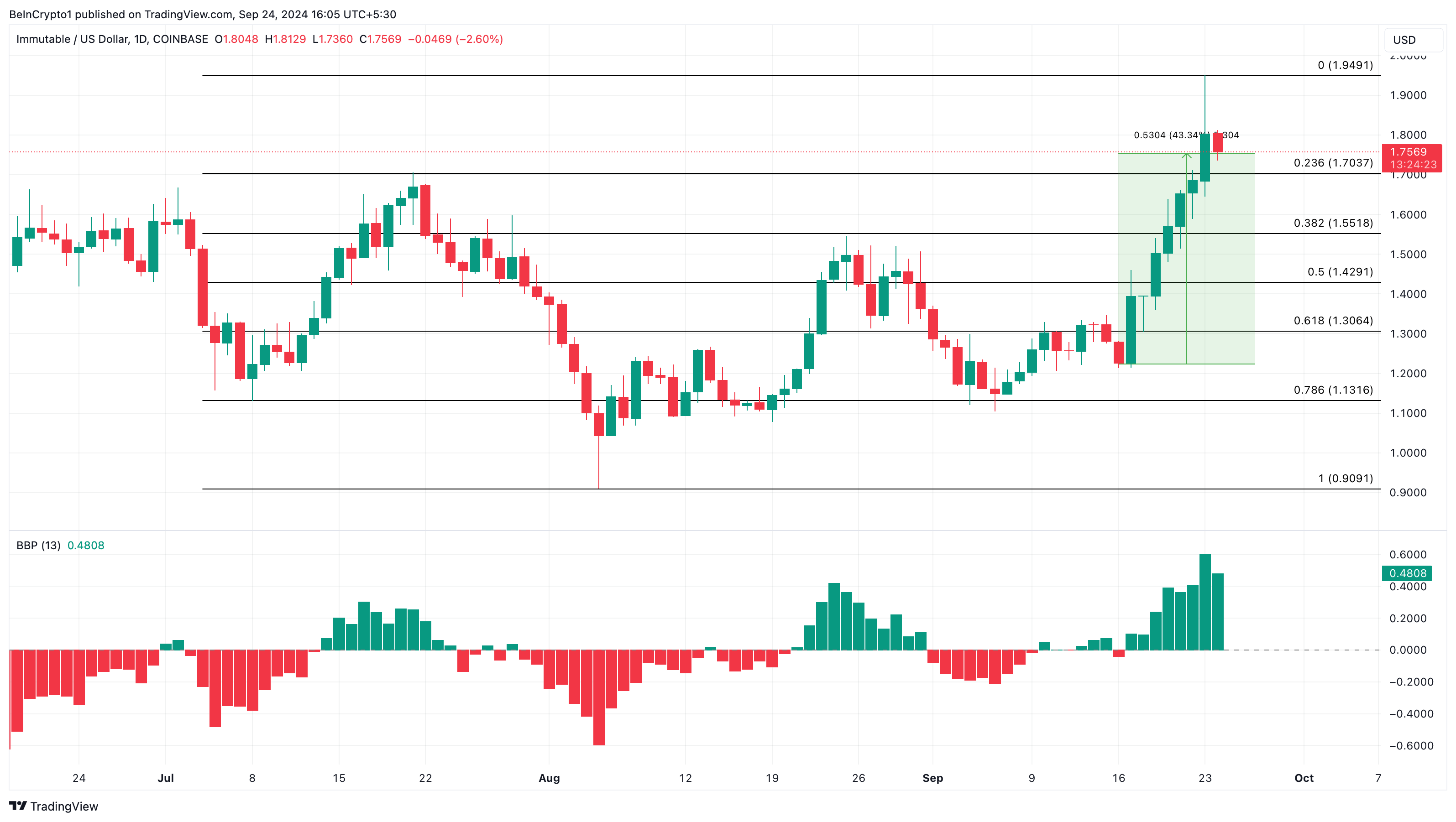 IMX มีการเพิ่มขึ้นของราคา 43% ในช่วงเวลานี้ แต่พบกับการต้านทานที่ 1.80 USD ทำให้ต้องถอยกลับไปที่ 1.75 USD ซึ่งเป็นราคาซื้อขายปัจจุบัน ค่าพลังกระทิงและหมี (BBP) บนแผนภูมิรายวันบ่งชี้ว่ากระทิงพร้อมที่จะผลักดัน IMX ให้สูงขึ้นอีกครั้ง