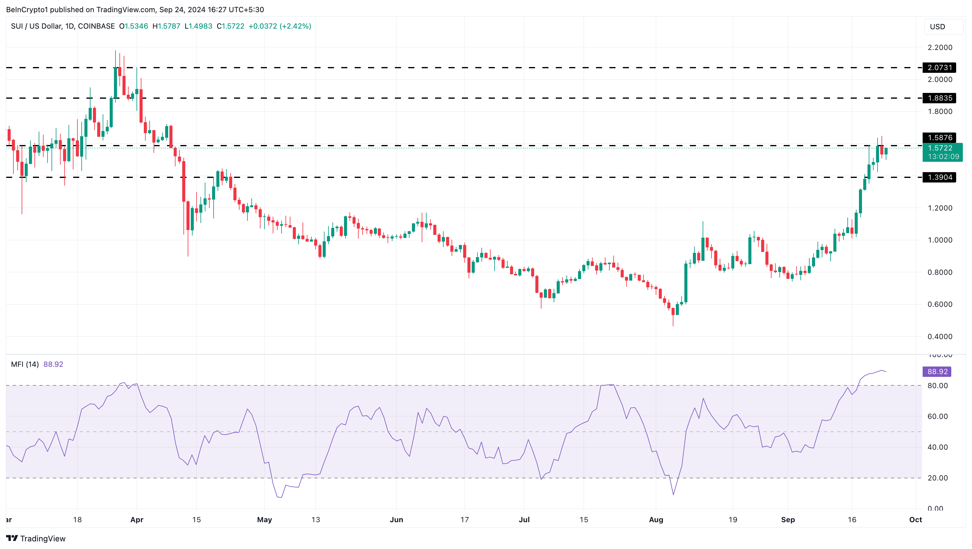 ในช่วงเจ็ดวันที่ผ่านมา ราคาของ SUI เพิ่มขึ้น 40% และปัจจุบันอยู่ที่ 1.55 USD ขณะเดียวกัน กราฟรายวัน SUI/USD แสดงถึงการเพิ่มขึ้นของดัชนีการไหลเข้าของเงิน (MFI) การเพิ่มขึ้นนี้บ่งชี้ถึงการเพิ่มขึ้นของแรงกดซื้อ อย่างไรก็ตาม MFI ยังสามารถบ่งบอกได้ว่าสกุลเงินดิจิทัลถูกซื้อมากเกินไปหรือขายมากเกินไป