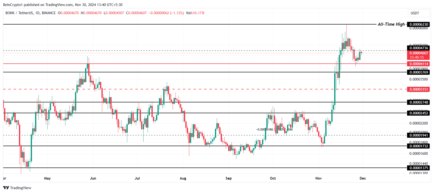 BONK ทำสถิติสูงสุดตลอดกาล (ATH) ที่ $0.00006230 เมื่อต้นเดือนนี้ก่อนที่จะลดลงไปที่ $0.00004607 การเปลี่ยนแปลงนี้เป็นเรื่องปกติสำหรับ memecoins ซึ่งสะท้อนถึงความผันผวนสูงในช่วงเวลาสั้นๆ แม้จะมีการลดลง แต่ BONK ยังคงมีศักยภาพที่สำคัญเมื่อสภาพตลาดเปลี่ยนแปลง