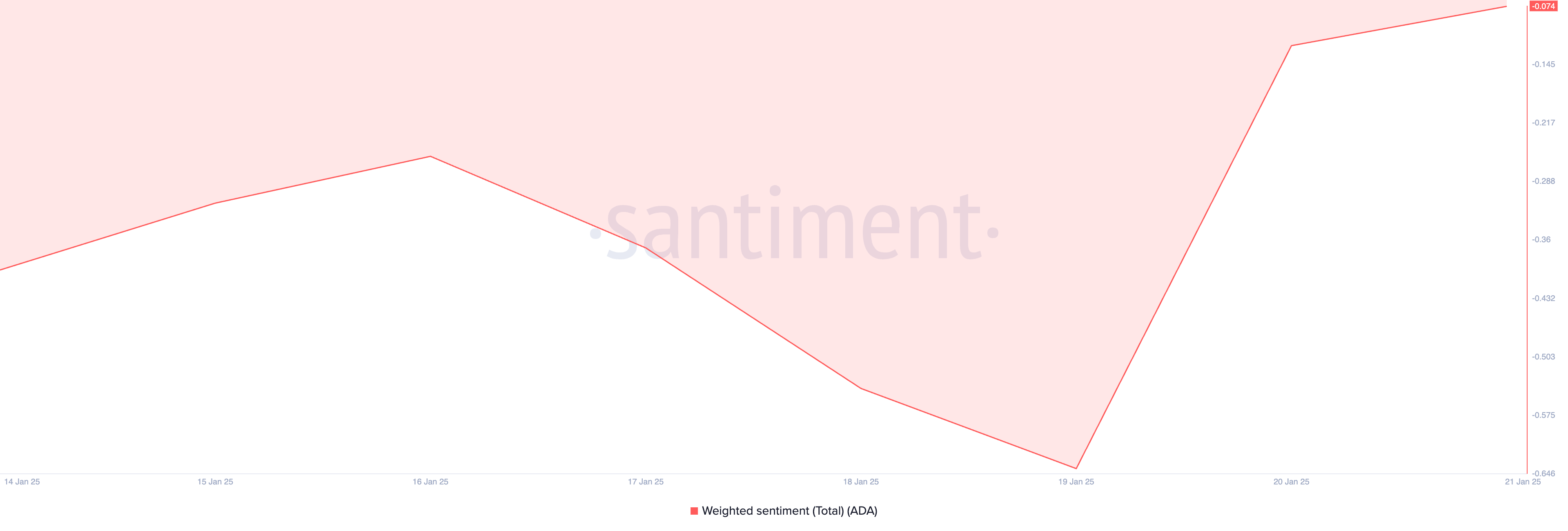 นอกจากนี้ ความรู้สึกถ่วงน้ำหนักของ ADA ยังคงเป็นลบ โดยปัจจุบันอยู่ที่ -0.074 ซึ่งเสริมความรู้สึกเชิงลบต่อ altcoin นี้