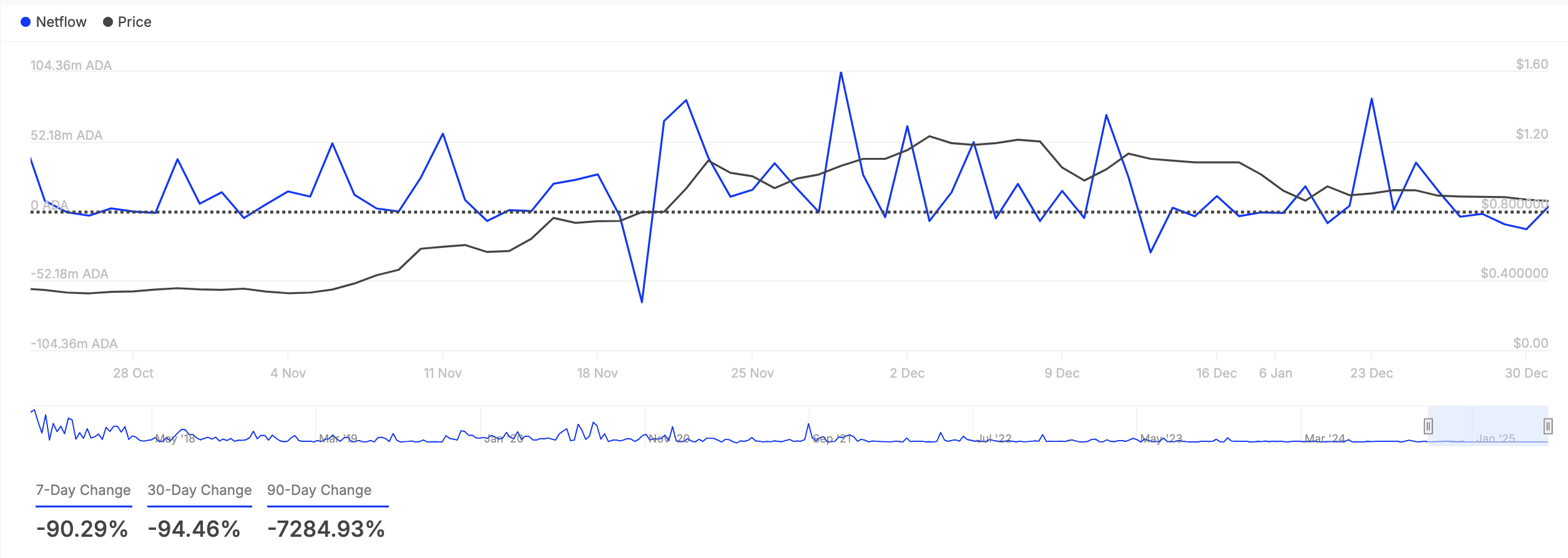 ผู้ถือครองรายใหญ่ ซึ่งกำหนดเป็นที่อยู่ที่ถือครองมากกว่า 0.1% ของอุปทานหมุนเวียนของสินทรัพย์ มีบทบาทสำคัญในการเคลื่อนไหวของตลาด การลดลงของการไหลสุทธิของพวกเขาบ่งชี้ถึงการลดกิจกรรมการซื้อ ซึ่งเพิ่มแรงกดดันให้ราคาของ ADA ลดลง