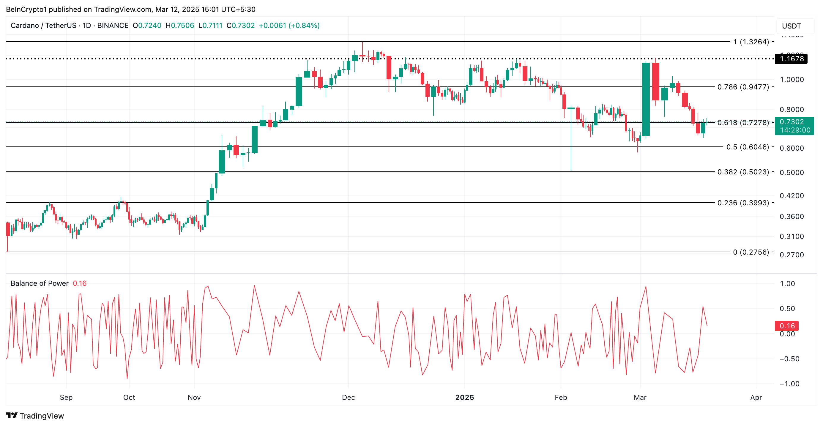 ในกราฟรายวัน Balance of Power (BoP) ของ ADA เป็นบวกที่ 0.30 ตัวชี้วัดนี้เปรียบเทียบความแข็งแกร่งของผู้ซื้อและผู้ขายในตลาด