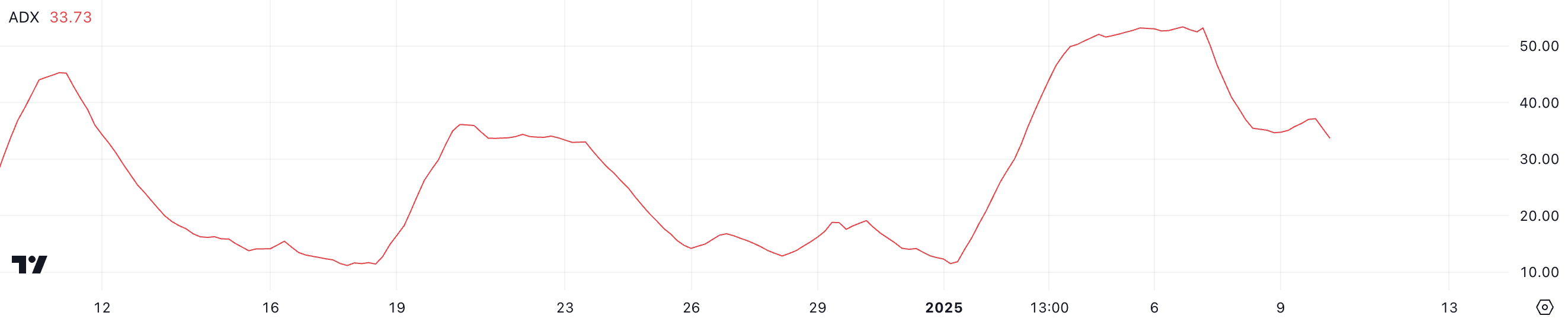 คาร์ดาโน ดัชนีทิศทางเฉลี่ย (ADX) ปัจจุบันอยู่ที่ 33.7 ซึ่งลดลงอย่างมีนัยสําคัญจากจุดสูงสุดล่าสุดที่ 53.2 เมื่อสามวันก่อน ADX เป็นตัวบ่งชี้ทางเทคนิคที่ใช้ในการวัดความแข็งแกร่งของแนวโน้ม ไม่ว่าจะเป็นขาขึ้นหรือขาลง ในระดับตั้งแต่ 0 ถึง 100