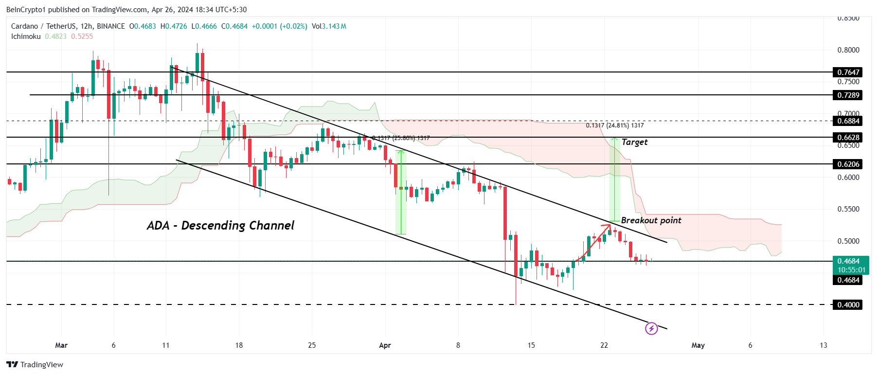 ในทางกลับกันหาก ราคาของ Cardano สามารถเด้ง ออกจากแนวรับ 0.46 ดอลลาร์ได้ก็สามารถเรียกคืน 0.50 ดอลลาร์เป็นแนวรับได้ ราคานี้เป็นแนวรับทางจิตวิทยาที่สําคัญ และการฝ่าฝืนจะทําให้ขาลงเป็นโมฆะ และเปิด ADA ให้ปรับตัวขึ้นต่อไป