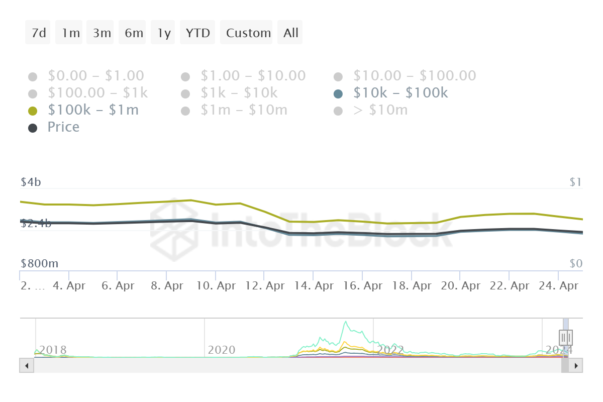 โดยเฉพาะอย่างยิ่ง ADA Whales ยังคงเทขายการถือครองเพื่อชดเชยการขาดทุนที่อาจเกิดขึ้น กระเป๋าที่ถือ ADA มูลค่าระหว่าง 10,000 ถึง 100,000 ถึง 100,000 ถึง 1 ล้านดอลลาร์ได้ขายอุปทานมูลค่าเกือบ 1 พันล้านดอลลาร์ในช่วงสองสัปดาห์ที่ผ่านมา