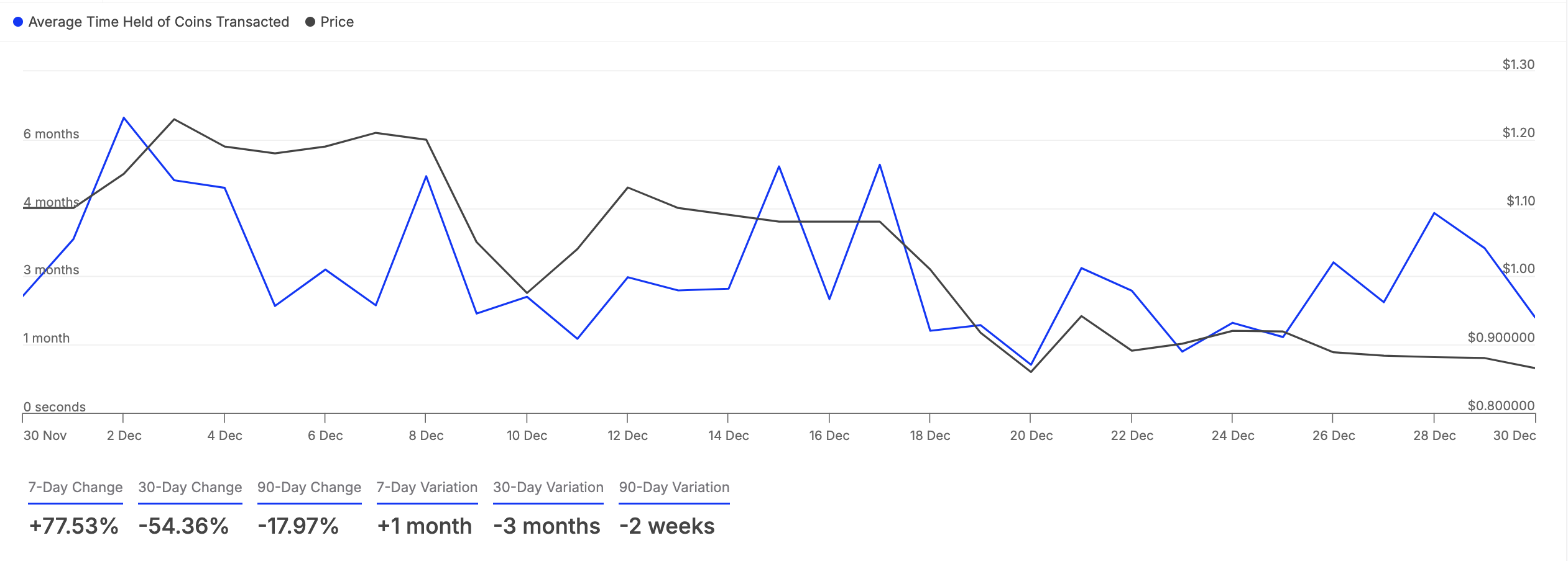 ระยะเวลาการถือครองของเหรียญที่ทำธุรกรรมติดตามระยะเวลาเฉลี่ยที่เหรียญถูกเก็บไว้ในกระเป๋าก่อนที่จะขายหรือโอน