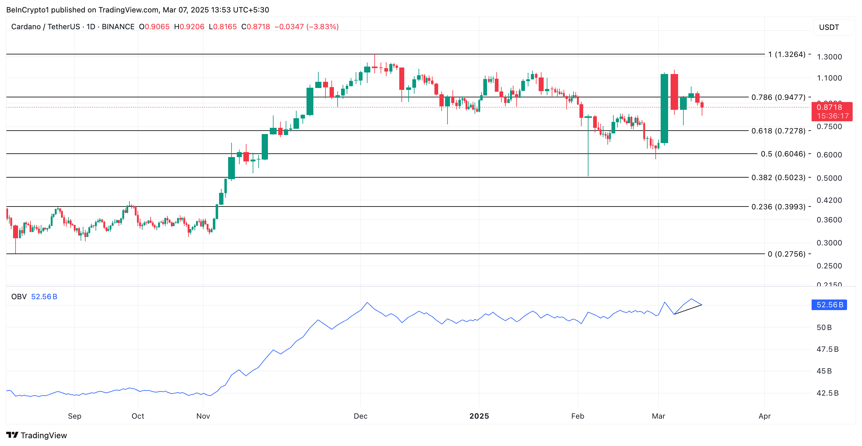 ในกราฟรายวัน OBV ของ ADA ที่เพิ่มขึ้นยืนยันถึงการเพิ่มขึ้นของความต้องการ ปัจจุบันอยู่ที่ 52.56 พันล้าน เพิ่มขึ้น 2% ตั้งแต่วันที่ 1 มีนาคม