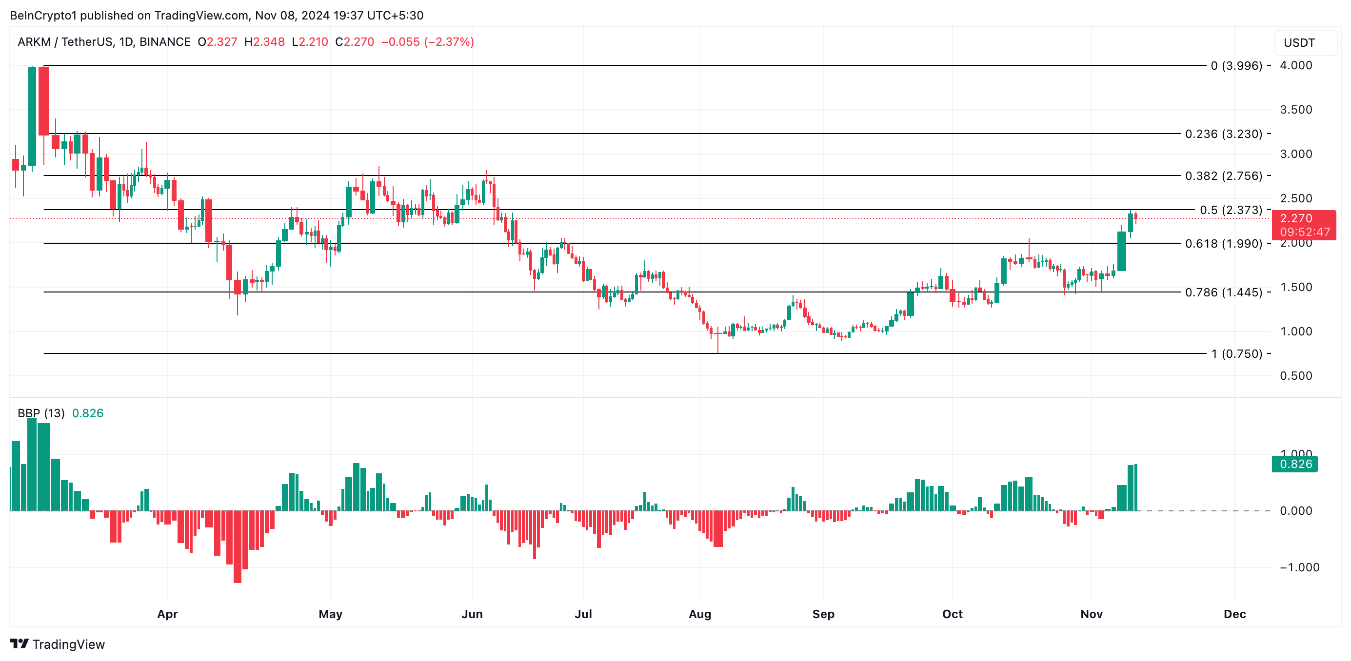 ARKM ขับเคลื่อน Arkham แพลตฟอร์มวิเคราะห์บล็อกเชนที่ใช้ AI สำหรับการวิเคราะห์บนเชน ปัจจุบันมีการซื้อขายที่ USD 2.27 โดยมีการเพิ่มขึ้นของราคา 37% ในสัปดาห์ที่ผ่านมา ยังคงมีแนวโน้มที่ดีต่อเนื่อง ตามที่แสดงโดยดัชนี Elder-Ray ที่เป็นบวก ณ เวลานี้ ค่านี้อยู่ที่ 0.82