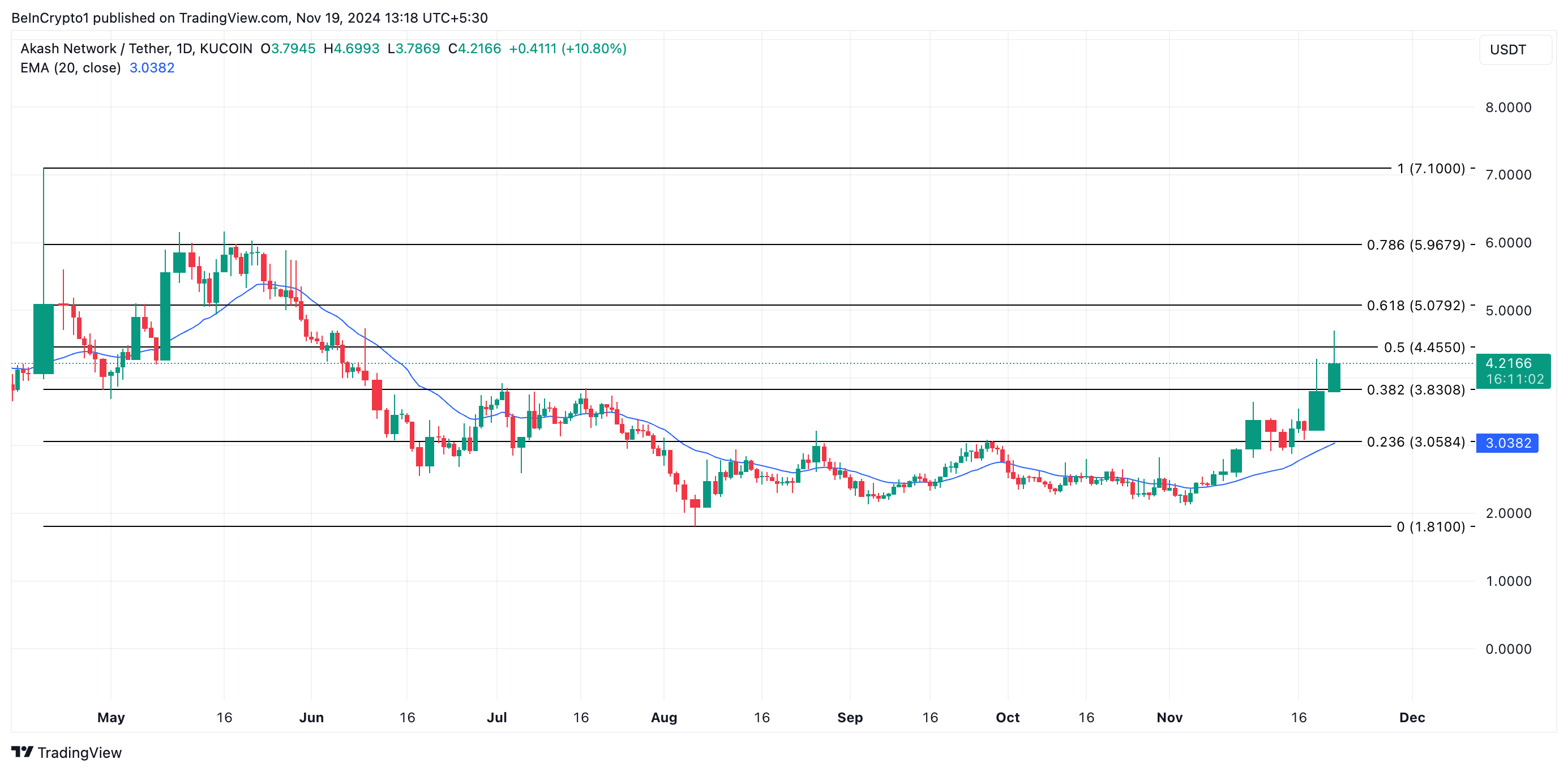 การเติบโตนี้ตามมาหลังจากการเปิดตัวสัญญาถาวรของ AKT บน Binance Futures เมื่อวันจันทร์ ปัจจุบัน สกุลเงินดิจิทัลนี้มีการซื้อขายที่ 4.21 USD โดยมีแรงผลักดันที่แข็งแกร่งซึ่งบ่งชี้ว่าการรวมตัวอาจยังคงดำเนินต่อไป