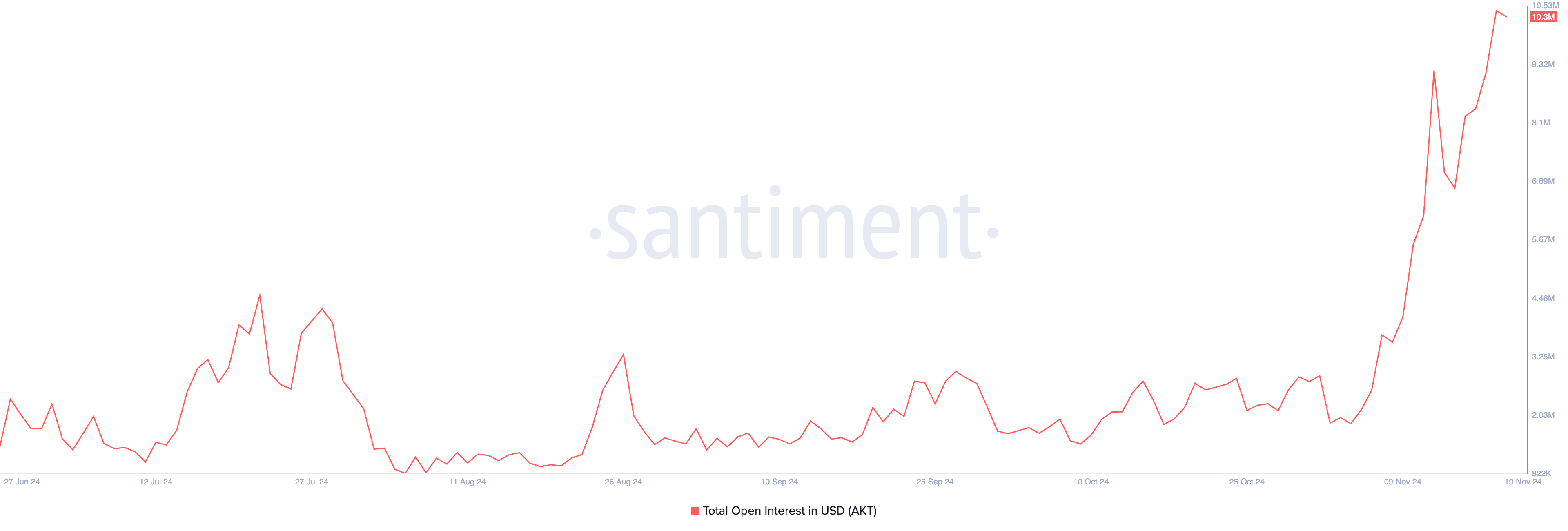นอกจากนี้ การเพิ่มขึ้นของกิจกรรมยังสังเกตได้ในตลาดอนุพันธ์ของ AKT ในช่วง 24 ชั่วโมงที่ผ่านมา ดอกเบี้ยเปิดของมันเพิ่มขึ้น 50% ตาม Santiment ปัจจุบันมีมูลค่าอยู่ที่ 10 ล้าน USD