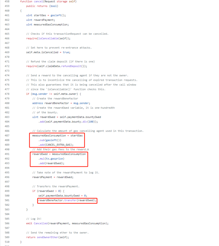 PeckShield ซึ่งเป็นบล็อกเชนรักษาความปลอดภัยเผยแพร่รายละเอียดของค่าธรรมเนียมการทำธุรกรรมรายการใหม่บน Smart Contract ของ TransactionRequestCore ที่เป็นของโปรเจกต์ Ethereum Alarm Clock