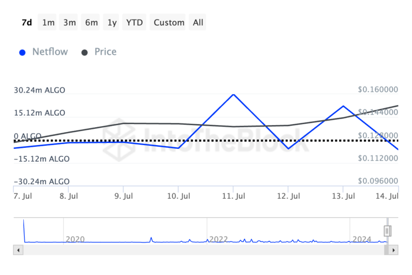 มูลค่าของ ALGO เพิ่มขึ้น 15% ในช่วงเจ็ดวันที่ผ่านมา และการไหลเข้าของผู้ถือจำนวนมากเพิ่มขึ้น 246% ในช่วงเวลาเดียวกัน
