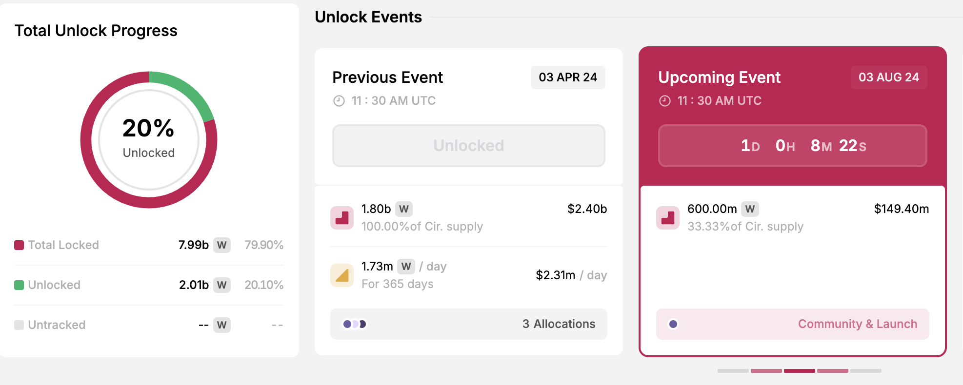 นอกจากนี้ กิจกรรมปลดล็อกโทเค็นยังก่อให้เกิดแรงกดดันของตลาด การเปิดตัวโทเค็น W 600 ล้านโทเค็นที่กําลังจะมาถึง ของ Wormhole ซึ่งคิดเป็น 33% ของอุปทานหมุนเวียนคาดว่าจะนําแรงขายจํานวนมากเข้าสู่ตลาด